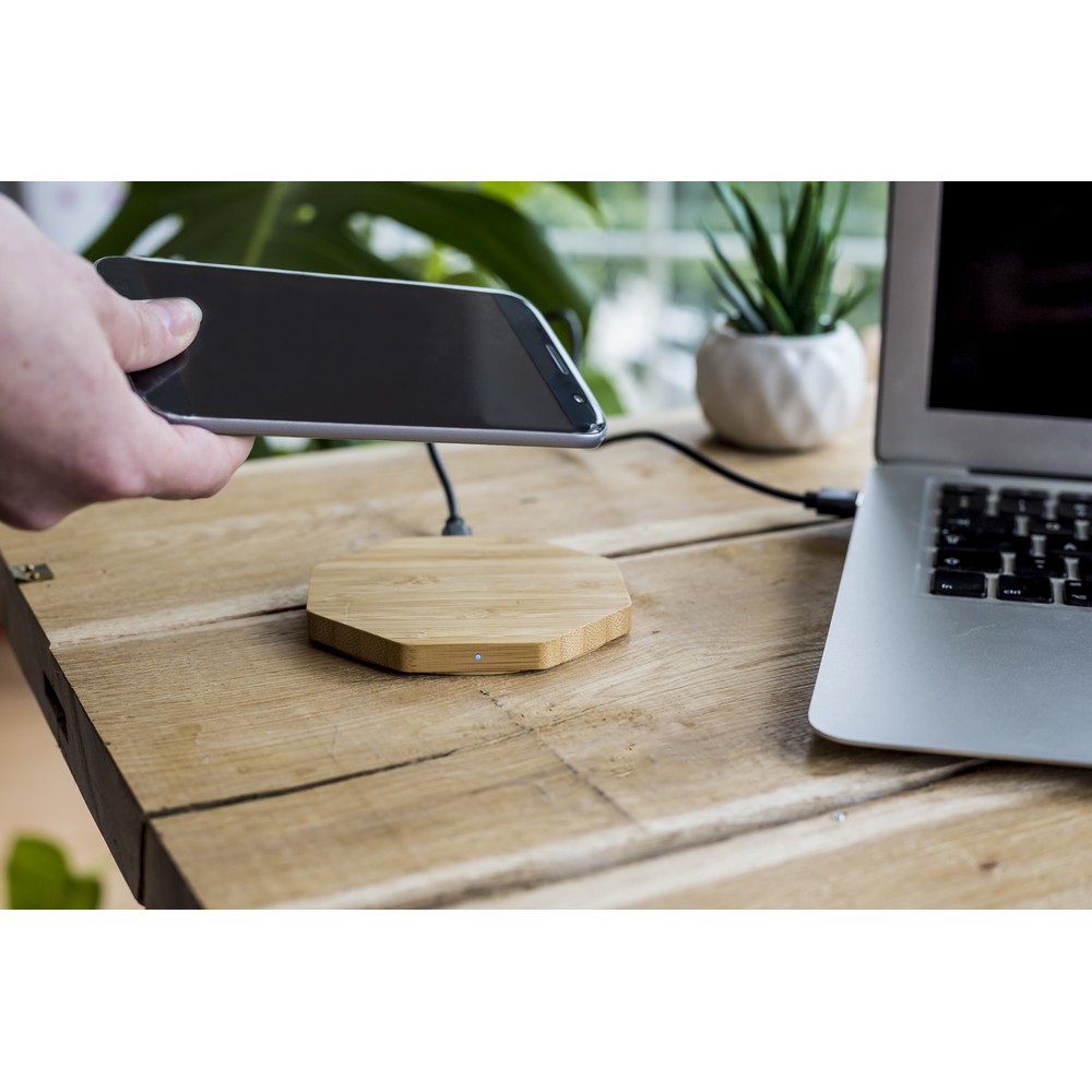 Bambusowa ładowarka bezprzewodowa 5W, działa z urządzeniami posiadającymi możliwość ładowania indukcyjnego, wejście 5V/2A wyjście 5V/1A, kabel micro USB w komplecie