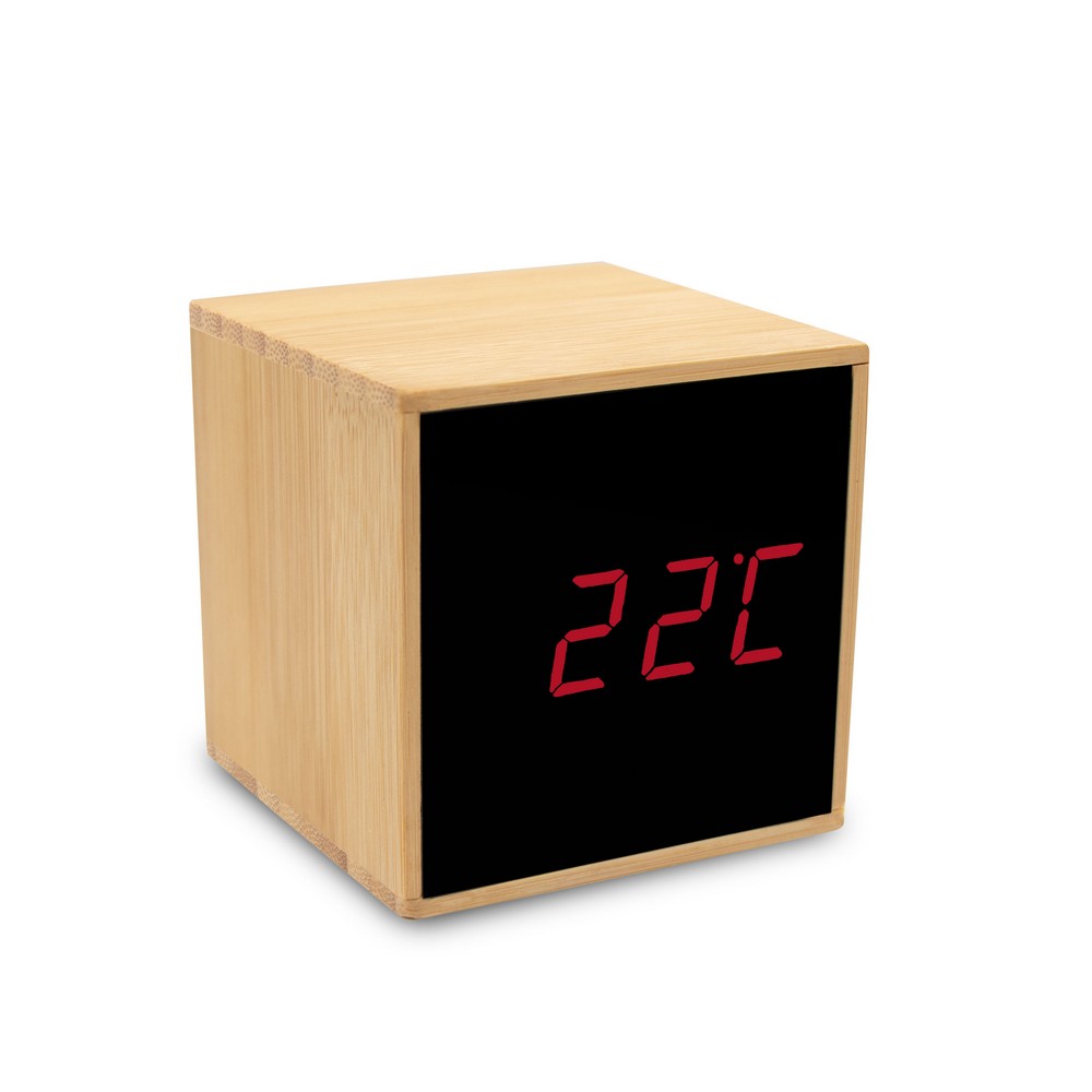 Bambusowy zegar na biurko, wyświetlacz LCD, zasilany przez kabel (w komplecie) 5V 500 mA, alternatywne źródło zasilania: 3 baterie AAA (nie są dołączone), możliwość zamontowania baterii CR2032 (nie jest dołączona) podtrzymującej ustawienia po odłączeniu od zasilania, funkcje: czas, data, temperatura, alarm (możliwość ustawienia 3 alarmów na 3 różne godziny)