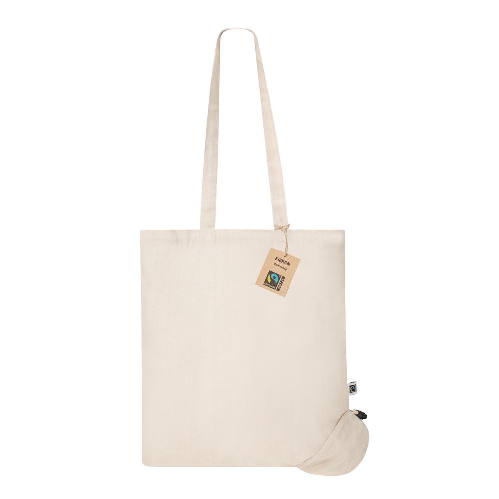 Torba na zakupy, składana, składa się do woreczka ze sznurkiem i plastikową blokadą, posiada długie uchwyty umożliwiające noszenie na ramieniu, produkt wykonany z bawełny o gramaturze 120 g/m², zgodny z certyfikatem FAIRTRADE