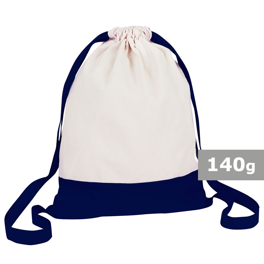 Dwukolorowy worek, posiada szerokie paski na ramię umożliwiające noszenie na plecach, pomieści drobne zakupy lub strój sportowy na siłownię, produkt wykonany z bawełny o gramaturze 140 g/m2