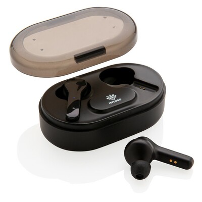 Bezprzewodowe słuchawki douszne TWS (True Wireless Stereo), BT 5.0, funkcja odbierania połączeń, muzyka oraz rozmowy telefoniczne stereo, etui z wbudowanym akumulatorem 300 mAh pełniące funkcję stacji ładującej w komplecie, grawer na stacji ładującej ukazuje podświetlaną powierzchnię, akumulator słuchawek umożliwia odtwarzanie muzyki do 3 godzin, ponowne naładowanie za pomocą etui w 1,5 godziny, zasięg do 10 metrów, 3 rozmiary nakładek dousznych w komplecie, kabel micro USB wykonany z TPE bez dodatku PVC w komplecie, ślad węglowy produktu: 0,74 kg CO2