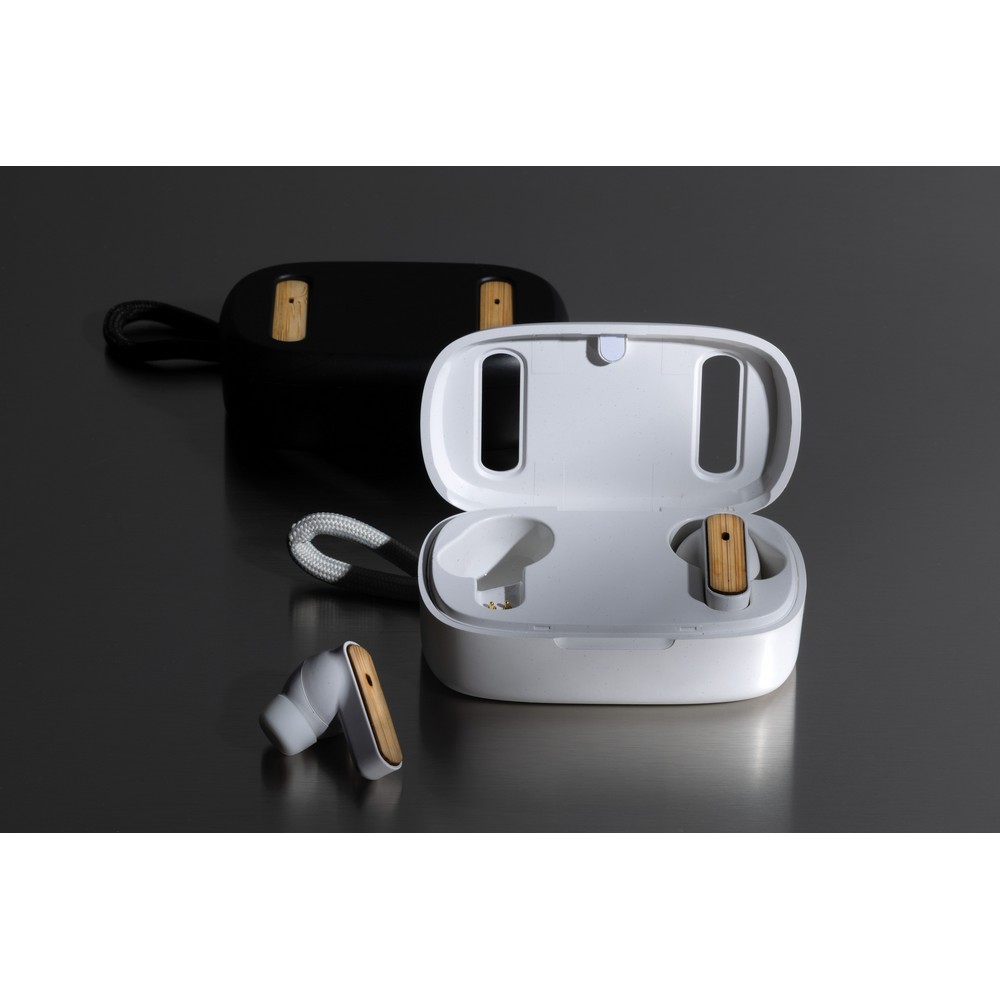 Bezprzewodowe słuchawki douszne stereo, BT 5.3, wykonane z ABS z recyklingu z certyfikatem RCS i bambusa wbudowany mikrofon, funkcja odbierania połączeń, w komplecie etui z akumulatorem 400 mAh pełni funkcję stacji ładującej, akumulator słuchawek o pojemności 40 mAh umożliwia odtwarzanie muzyki na średnim poziomie głośności do 5 godzin, ponowne naładowanie za pomocą etui w 1 godzinę, zasięg do 10 m, 3 rozmiary nakładek dousznych w komplecie, nie zawiera PVC