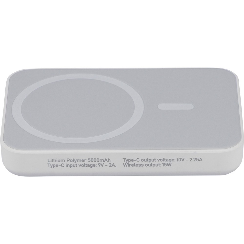 Bezprzewodowy Power Bank 5000 mAh, z wyjściem ładowania bezprzewodowego 15W, ładowanie przez końcówkę typu-C, wejście typu-C: DC 5V 3A, DC 9V 2A, wyjście typu-C: DC 5V 3A, DC 9V 2,22A, DC 12V 1,67A, zawiera ochronę przed przegrzaniem, zwarciem, przepięciem i nadprądem, zapakowany pojedynczo w brązowe pudełko kartonowe z papierowym wypełnieniem bez torebki foliowej, ikona RABS na produkcie, produkt wykonany z recyklingowego ABS z baterią litowo-jonową