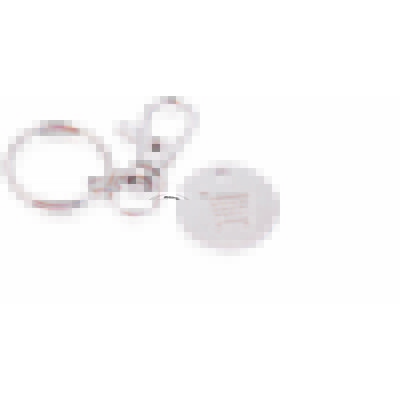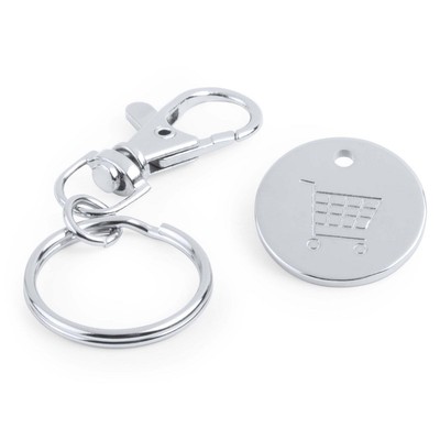 Brelok do kluczy z karabińczykiem umożliwiającym przypinanie, posiada wyjmowany żeton do wózka na zakupy w rozmiarze 1 zł, produkt wykonany z metalu