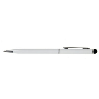 Długopis z kolorowym trzonem i elementami w srebrnym kolorze, niewielka średnica nadaje nowoczesnego wyglądu, końcówka touch pen umożliwiająca obsługę ekranów dotykowych, wkład w niebieskim kolorze, produkt wykonany z aluminium