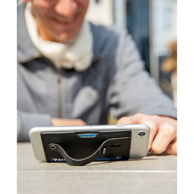Etui na karty kredytowe 3 w 1, stojak na telefon, uchwyt do telefonu, ochrona RFID, mieści do 2 kart, wykonane z PU, posiada taśmę umożliwiającą przyczepienie do płaskiej powierzchni telefonu, po wysunięciu paska działa jako uchwyt lub stojak na telefon, ślad węglowy produktu: 0,09 kg CO2