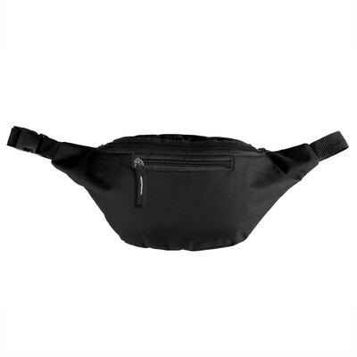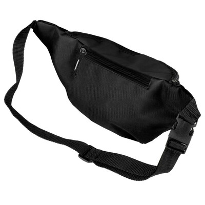 Saszetka zapinana w pasie, przegroda główna oraz przednia i tylna kieszeń zamykane na zamek błyskawiczny, regulowany pasek umożliwiający dopasowanie obwodu: min. ok. 77 cm, max. ok. 111 cm, produkt wykonany z poliestru 600D