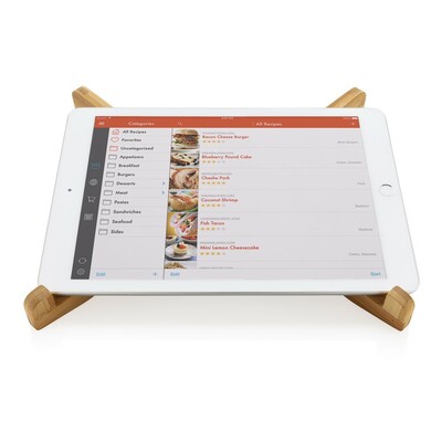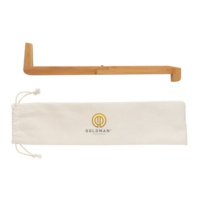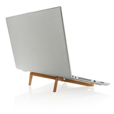 Składany stojak na laptopa, tablet, wykonany z wytrzymałego, naturalnego bambusa, podstawka zapewnia odpowiedni poziom cyrkulacji powietrza pod urządzeniem oraz właściwe położenie ekranu, kompatybilny z laptopami do 15,6″, może również służyć jako stojak na książkę, bawełniane etui w komplecie, ślad węglowy produktu: 0,42 kg CO2