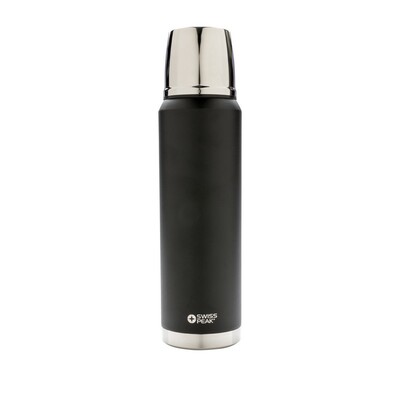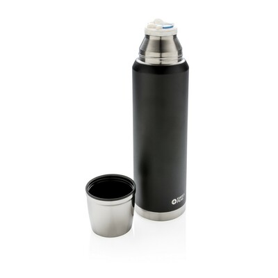Termos 1000 ml z izolacją próżniową, podwójne ścianki, wnętrze ze stali nierdzewnej 18/8, powlekany proszkowo czarny kolor cechujący się niezwykłą trwałością i odpornością na wyblaknięcie czy popękanie, ściana wewnętrzna pokryta miedzią o wysokim poziomie przewodnictwa, wyłącznie mycie ręczne, utrzymuje temperaturę napojów gorących do 20 godzin oraz zimnych do 24 godzin +leakproof