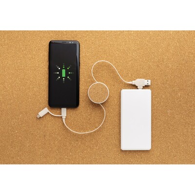 Zwijany kabel do ładowania, końcówki: USB, 2 x USB C, 2 w 1 (micro USB oraz kompatybilna z urządzeniami iOS), obudowa wykonana z mieszanki 35% korka i słomy pszenicznej oraz ABS, kable z TPE niezawierającego PVC, długość do 100 cm, ślad węglowy produktu: 0,23 kg CO2