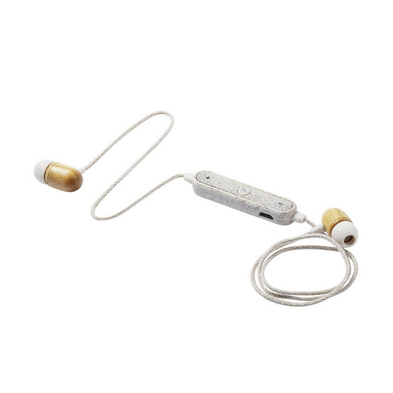 Słuchawki bezprzewodowe BT 5.0, douszne, słuchawki wykonane z bambusa, panel regulacji wykonany ze słomy pszenicznej, kable pokryte materiałem z konopi, funkcja odbierania połączeń, panel regulacji,