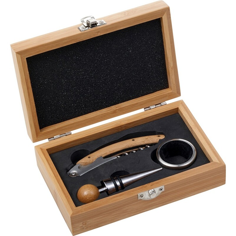 Zestaw do wina, 3 el. w bambusowym pudełku, akcesoria do wina: korkociąg ze stali nierdzewnej, pierścień do wina i zatyczka, z bambusowymi elementami