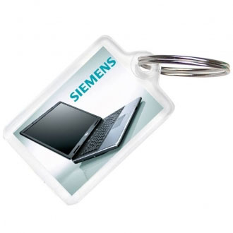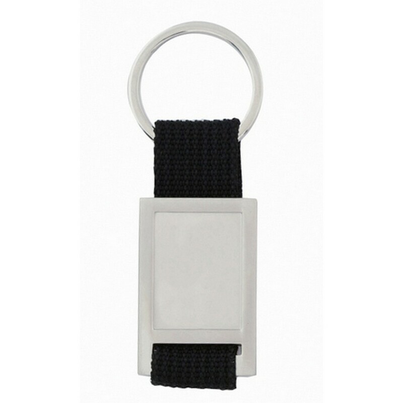 Wąski prostokątny brelok do kluczy, silikonowy z metalową plakietką, w pudełku